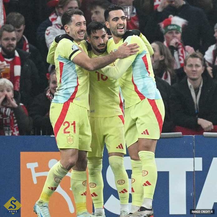 সমান ম্যাচ থেকে ৭ পয়েন্ট নিয়ে ডেনমার্ক আছে দ্বিতীয় স্থানে।ডেনমার্কের মাঠে ম্যাচের ১৫ মিনিটেই এগিয়ে যায় স্পেন। এ সময় আক্রমণে উঠে ডি বক্সের ডানদিক থেকে ভেতরে বল বাড়িয়ে দেন আয়োজ পেরেজ। সেটি পেয়ে খুব কাছ থেকে ডান পায়ের শটে জালে পাঠান মিকেল ওয়ারজাবাল। প্রথমার্ধে এই একটি গোলই হয়। বিরতির পর ৫৮ মিনিটে ব্যবধান দ্বিগুণ করে স্পেন। এ সময় মাঝমাঠের একটু সামনে থেকে দানি ওলমোর বাড়িয়ে দেওয়া বল পেয়ে যান পেরেজ। তিনি ঢুকে পড়েন বক্সের মধ্যে। এরপর দূরের পোস্টকে লক্ষ্য করে নিশানাভেদ করেন। ডেনমার্কের গোলরক্ষক কিছুই করার সুযোগ পাননি।৮৪ মিনিটে অবশ্য ব্যবধান কমায় ডেনমার্ক। এ সময় স্পেনের রক্ষণভাগের খেলোয়াড় ব্যাকপাস দেন গোলরক্ষককে উদ্দেশ্য করে। সেটির নাগাল পেয়ে যান ডেনমার্কের গুস্তাভ ইসাকসেন।