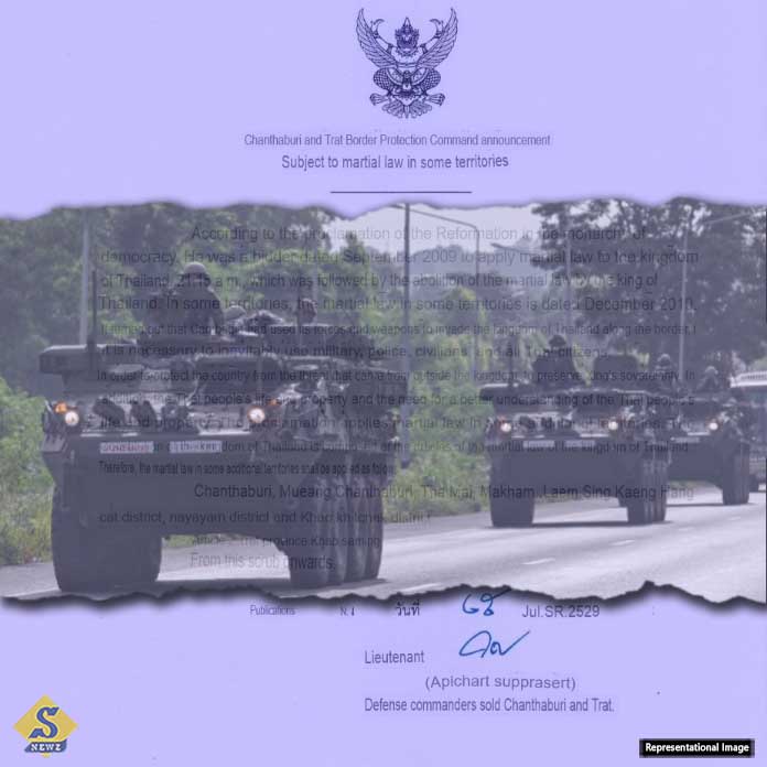 কম্বোডিয়ার সঙ্গে সংঘর্ষের দ্বিতীয় দিনে হামলা পাল্টা হামলার মধ্যেই সীমান্তবর্তী আটটি জেলায় সামরিক আইন জারি করেছে থাইল্যান্ড। চনথাবুরি ও ত্রাত প্রদেশে সেনাবাহিনীর সীমান্ত প্রতিরক্ষা কমান্ডের কমান্ডার আপিচারট সাপরাসার্ট এক বিবৃতিতে বলেছেন, চনথাবুরির সাতটি জেলা ও ত্রাত প্রদেশের একটি জেলায় সামরিক আইন এখন থেকে কার্যকর থাকবে।