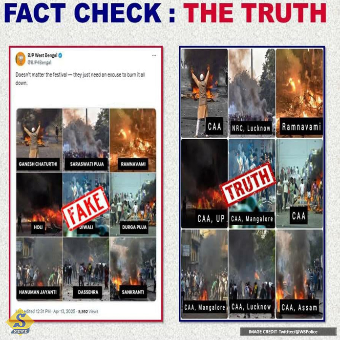 বিজেপির পোস্টে ঘটনাগুলি বিভিন্ন ধর্মীয় উৎসবের সময়ের দাবি করা হয়েছিল। এর পরেই রাজ্য পুলিশের সোশ্যাল মিডিয়ার পাতায় পাল্টা একটি পোস্ট করা হয়েছে। রাজ্য পুলিশের দাবি, বিজেপির পোস্টটি ভুয়ো, ঘটনাগুলির বেশির ভাগ নাগরিকত্ব সংশোধনী আইন বিরোধী আন্দোলনের সময়ের বলে দাবি পুলিশের। শুধু তাই নয়, গুজব বা ভুয়ো খবর রুখতে কিছু পদক্ষেপও করেছে পুলিশ। যদিও ওই ছবিগুলির সত্যতা যাচাই করেনি এস নিউজ বিজেপির পোস্ট করা ছবিগুলির মধ্যে কোনওটিতে দেখা গিয়েছে আগুন জ্বলছে, কোনও ছবিতে আবার দেখা যাচ্ছে বিক্ষোভ চলছে। যেমন রাস্তায় আগুন জ্বালিয়ে একটি বিক্ষোভের দৃশ্যকে গণেশ চতুর্থীর বলে দাবি করেছে বিজেপি। পুলিশের দাবি, সেটি নাগরিকত্ব সংশোধনী আইন বিরোধী আন্দোলনের সময়ের। আবার সরস্বতী পুজোর সময়ের অশান্তি বলে যেটি বিজেপি দাবি করেছিল, পুলিশের দাবি সেটি উত্তরপ্রদেশের লখনউয়ে জাতীয় নাগরিকপঞ্জী বিরোধী আন্দোলনের সময়ে।